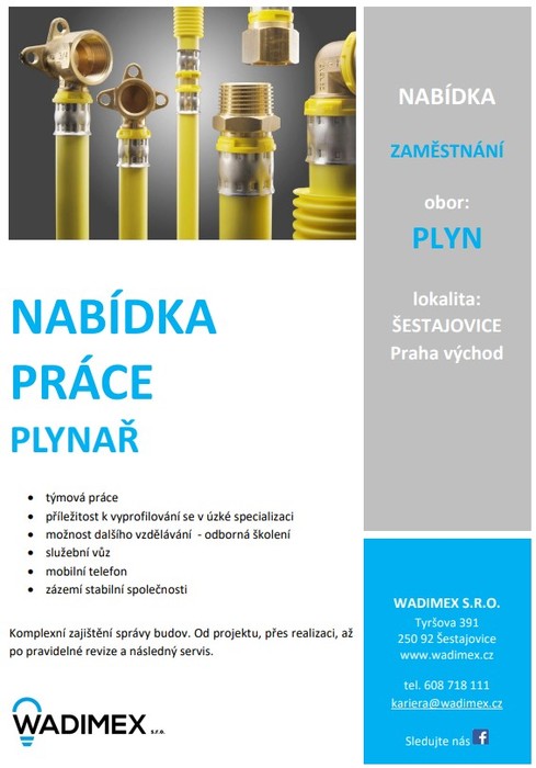 Firma Wadimex hledá absolventa plynaře pro oblast kolem Prahy (Jirny - Logistický park, Šestajovice).