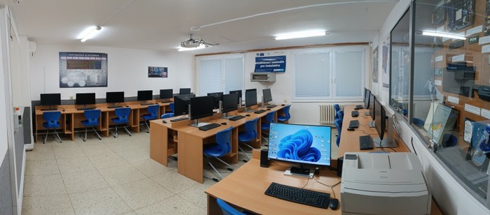 Klimatizovaná počítačová učebna je vybavena výkonnými stolními počítači Intel v provedení "mini" a 24" monitory. Provoz 18-ti žákovských stanic je možné řídit centrálně z učitelského počítače (zasílání zpráv, převzetí ovládání, omezení přístupu, blokace internetu, vypínání, živé sledování atd.). Jednotlivé stanice jsou připojeny ke stabilnímu internetu pomocí optického kabelu s rychlostí do 900 mbps. V učebně je možný tisk na A3, samozřejmostí je propojený dataprojektor.